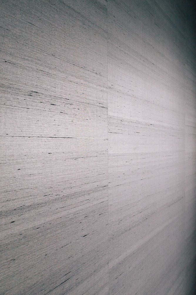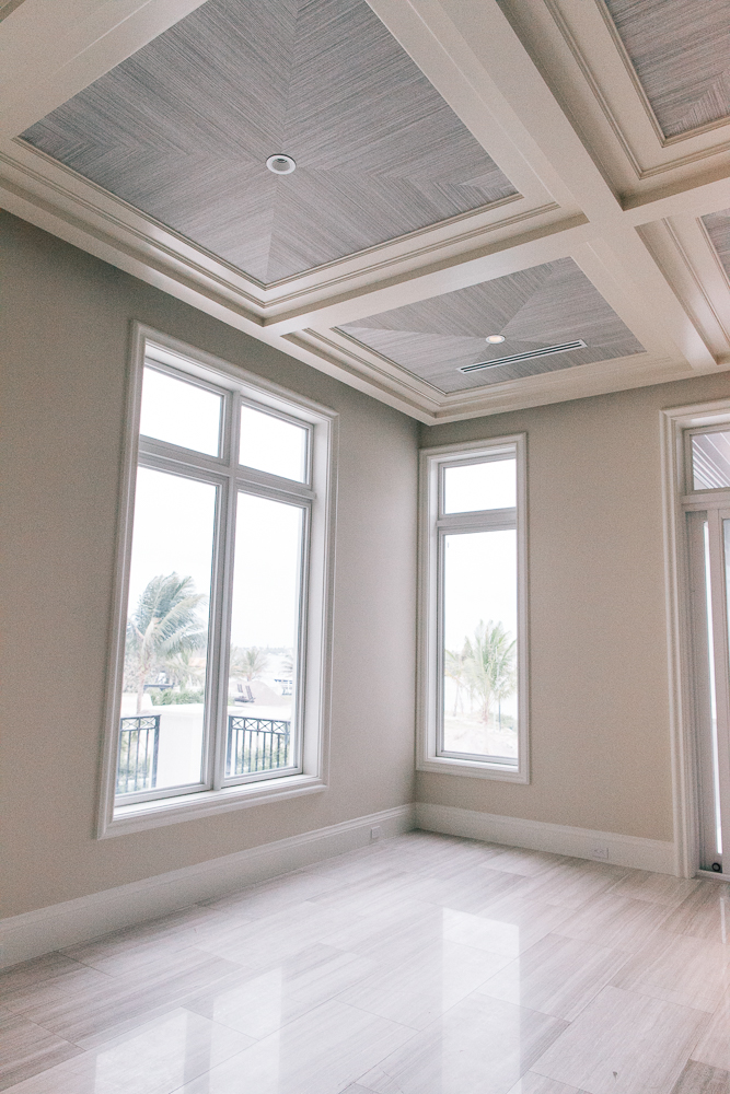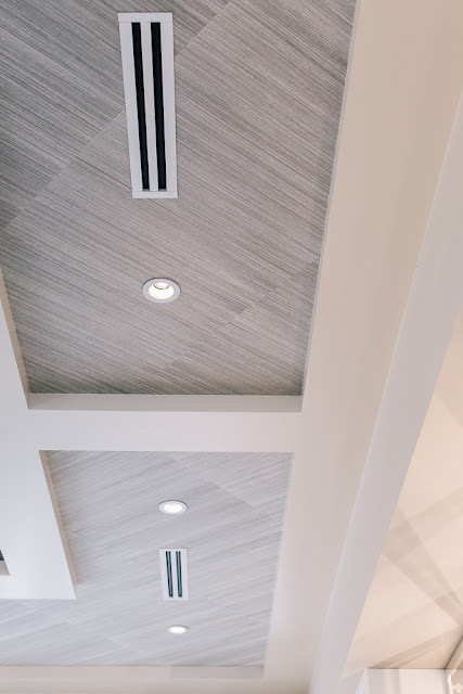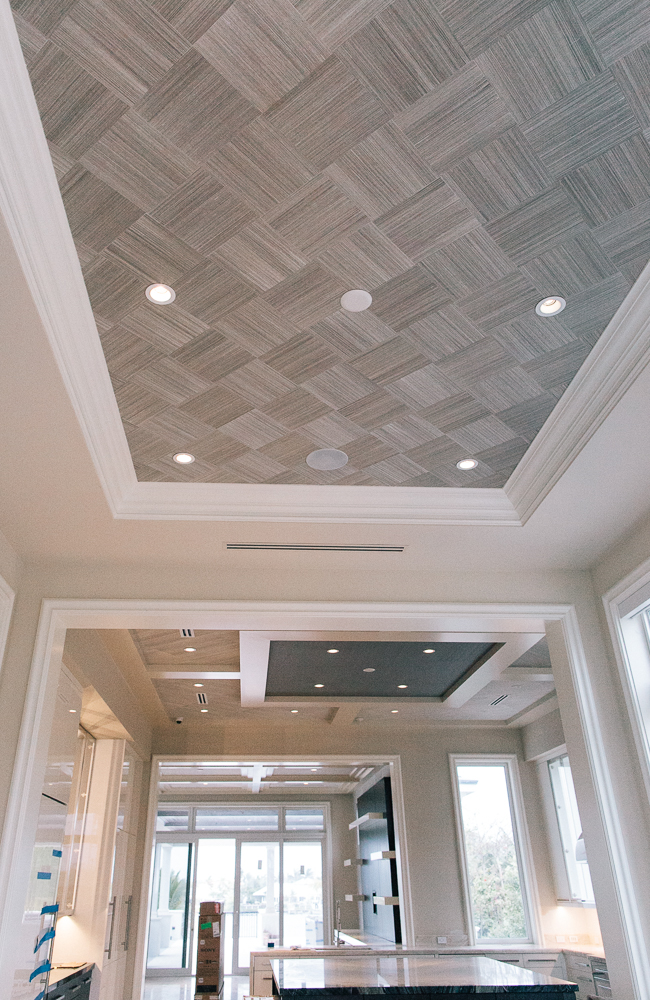 Above, you'll see the same wallpaper used on the ceiling in separate rooms, but each section is distinctly exclusive to its own space. Wendy Ricks, the installer that led a team of paperhanging contractors for this house project, made sure that the client's vision for a modern design would be achieved. She decided to do triangle diamond cuts, woven panels, and parallel lines for the ceiling installation.