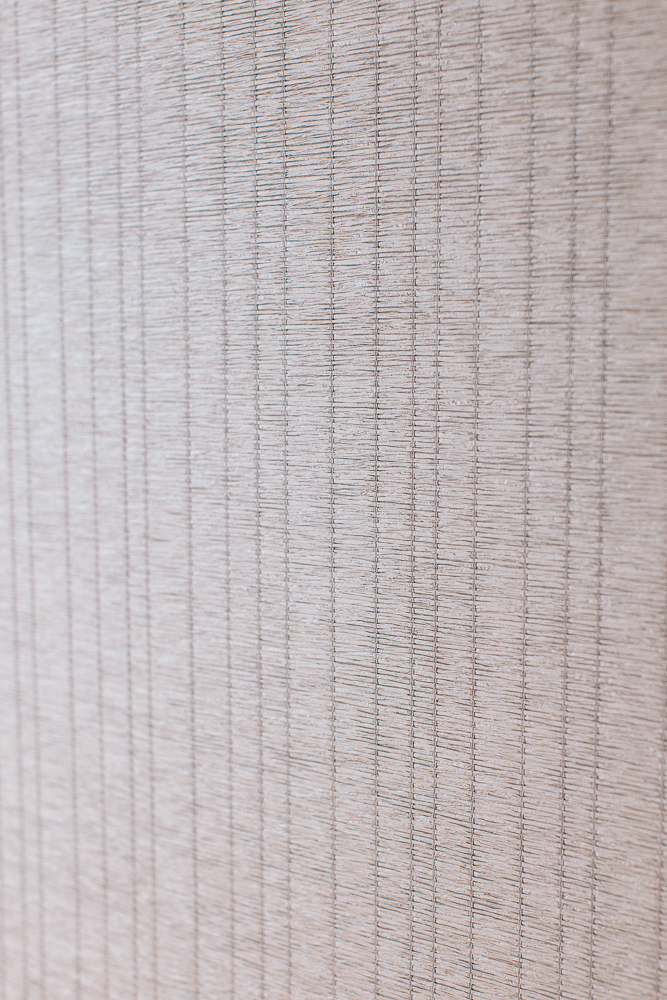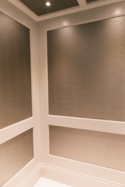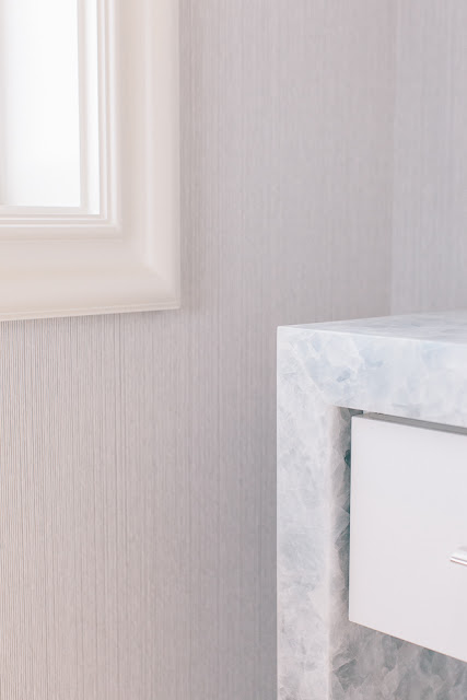 The wallpaper by Romo (in Haiku HAA21) accents the minimal hints of grey and lavender in this bathroom. It wraps it all together in a stunning bundle of luxury, topping it off with a silver metallic wallpaper on the ceiling by