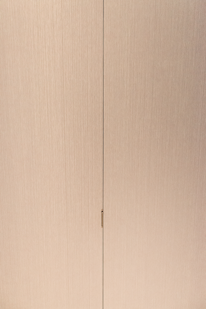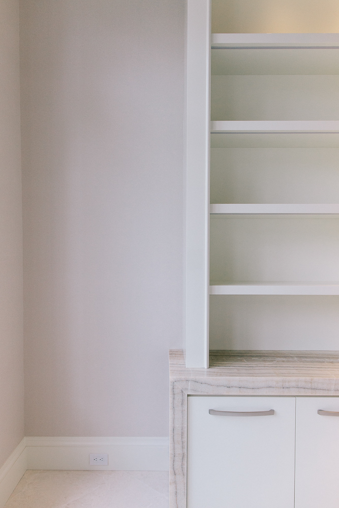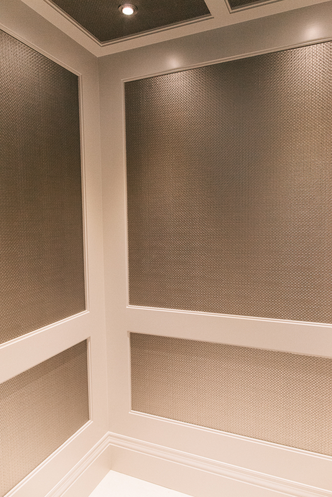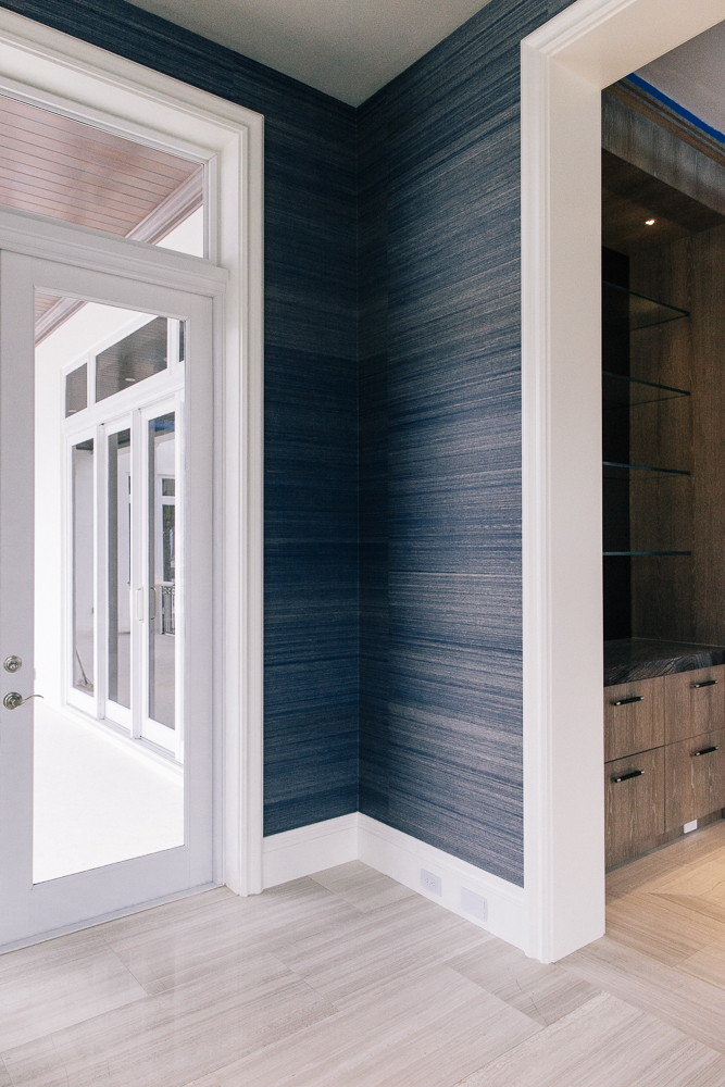 The club room (pictured above) conveys a simple and elegant aesthetic taking advantage of the blue tones from this Phillip Jeffries wallpaper (in Horsehair Denim 3258) to emphasize the neutral grey hues in the marble flooring and whites on the base boards and wall trimmings. The space presents itself as the perfect candidate to feature natural woods like oak, walnut, mahogany, and hard maple in cabinetry.