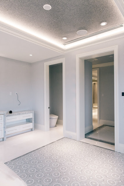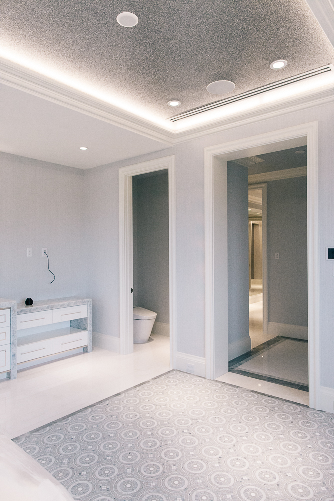 The glitter wallpapered ceiling above in this case is bordered by teal fluorescent lights to deceptively cast more of a cooler tone rather than warmer tones during both day and night. Why do you think our clients would choose that? Well, to achieve more of a monochromatic feel that repeats itself singularly from room to room.