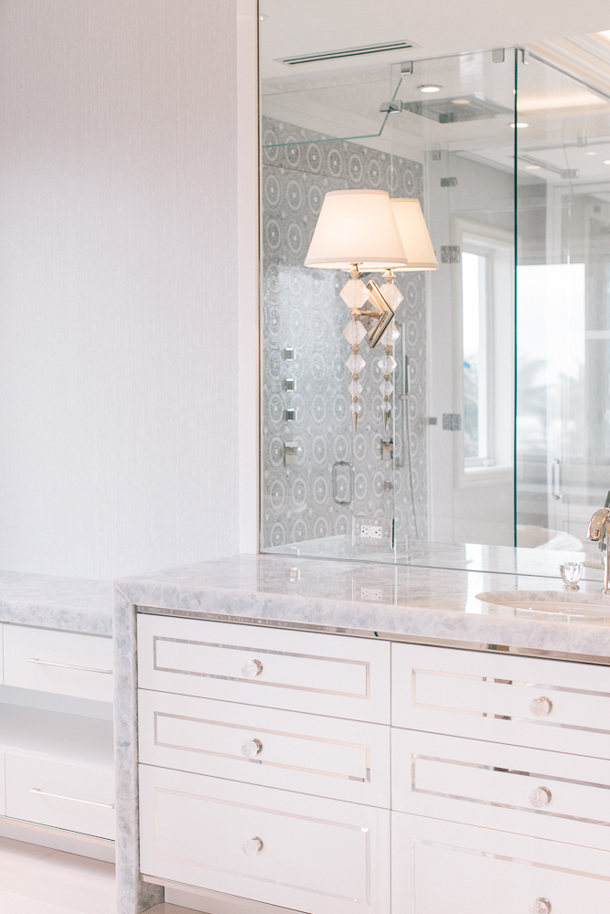 An intricate mosaic tiled shower leading out into the main floor beneath a deep white basin for a tub. A quartz counter top with regal mirror panels above and an ivory vanity with drawers below featuring crystal knobs. The gem drop lamps and porcelain floor.