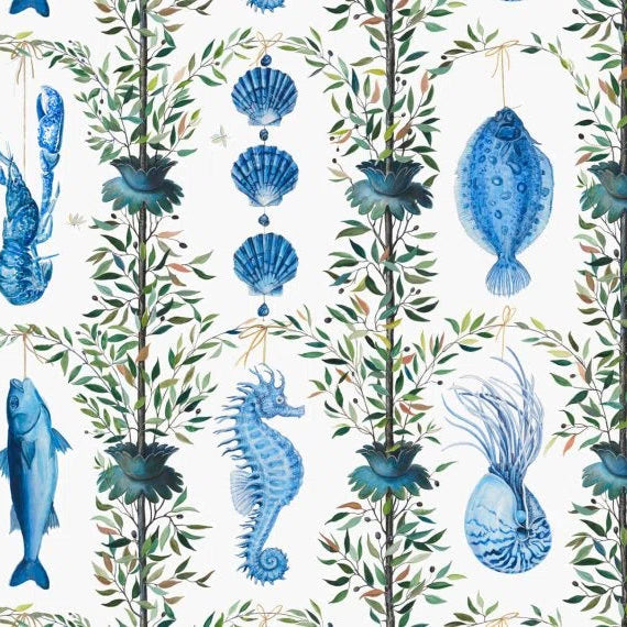 Inspired by vibrant fish markets, this design features sea creatures in shades of ultramarine blue and moss green. A coastal-inspired print on untrimmed, non-woven wallpaper sold by the meter.