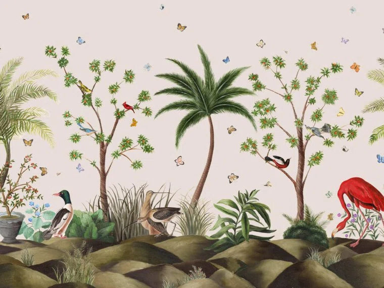 An exotic scene by Carlos Mota with butterflies, birds, and flamingos among palms and orange trees. Hand-painted and printed on vinyl with a raw silk effect for texture and depth.